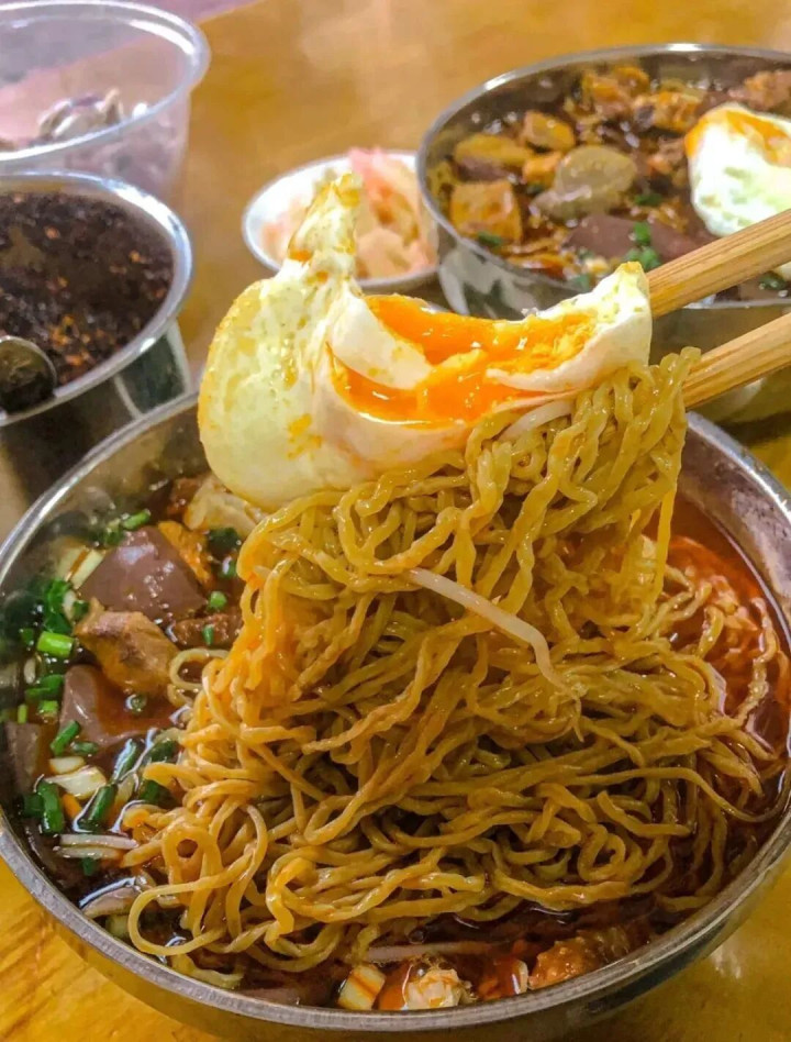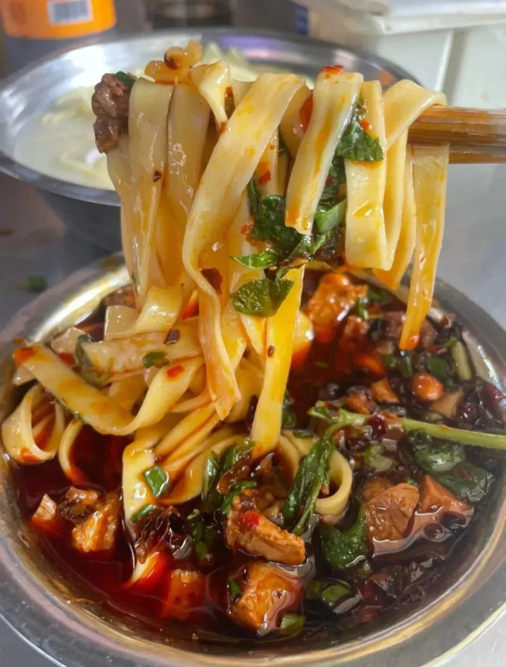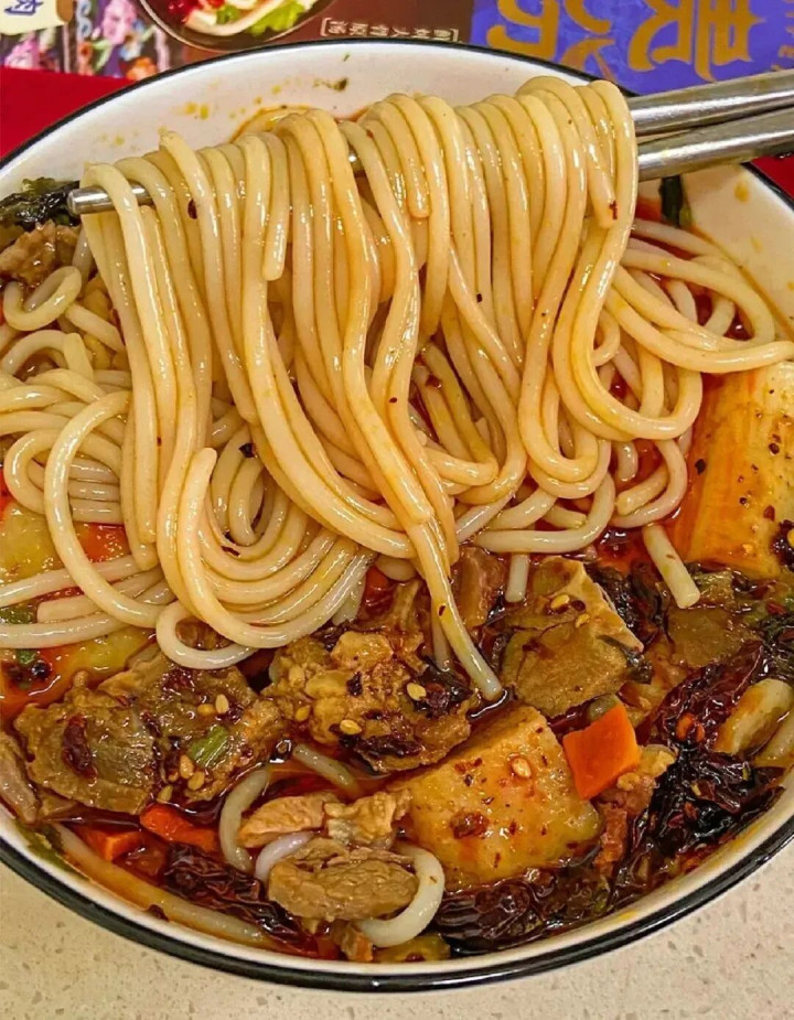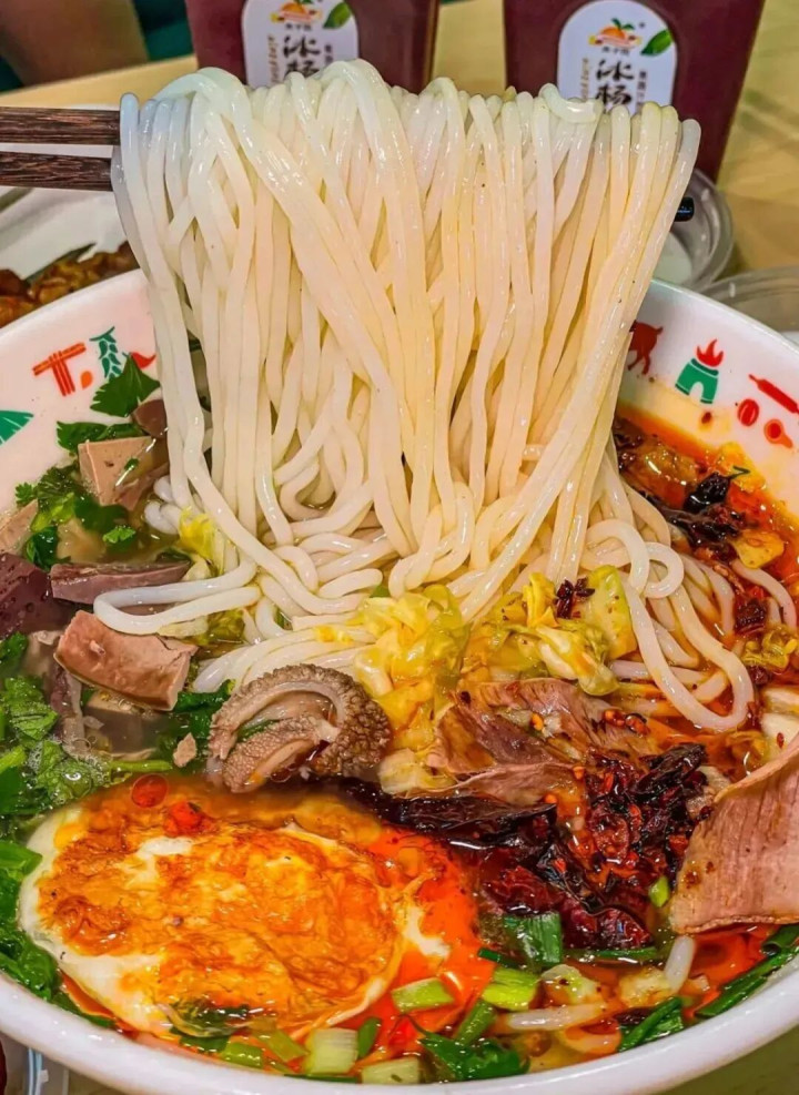 而贵阳老素粉,用的恰是酸粉。这种粉看着有筷子一般粗,米的浓度和密度也高于一般米粉,滋味微酸,又很有嚼劲,还带有多少野性的颗粒感,再配上爽口的佐料,不到5分钟就能嗦完一碗。 又因为制作酸粉对温度、湿度和手法都很进展,是以离开贵阳是很难再吃到的。 肠旺面 肠旺面最早是“肠旺粉”,它跟牛肉粉相通是腹地东谈主缺不了的“国民款”。但当牛肉粉申明大噪后,贵州东谈主就认定米粉的最好搭档是牛肉了。