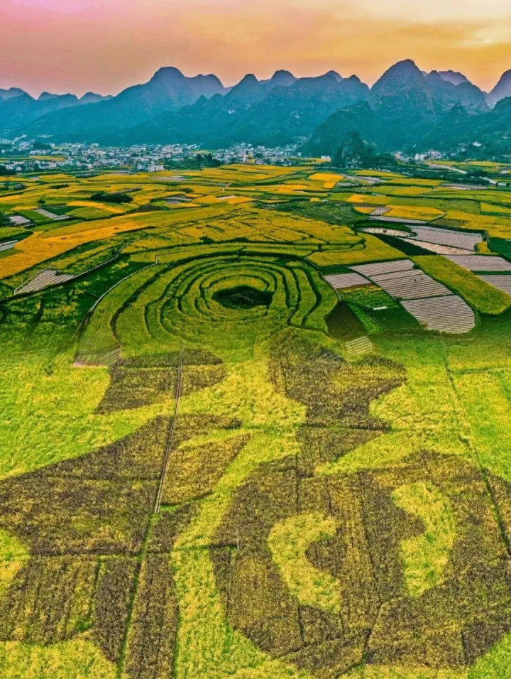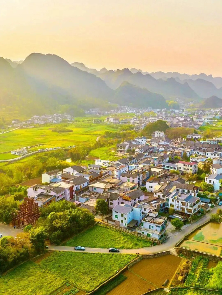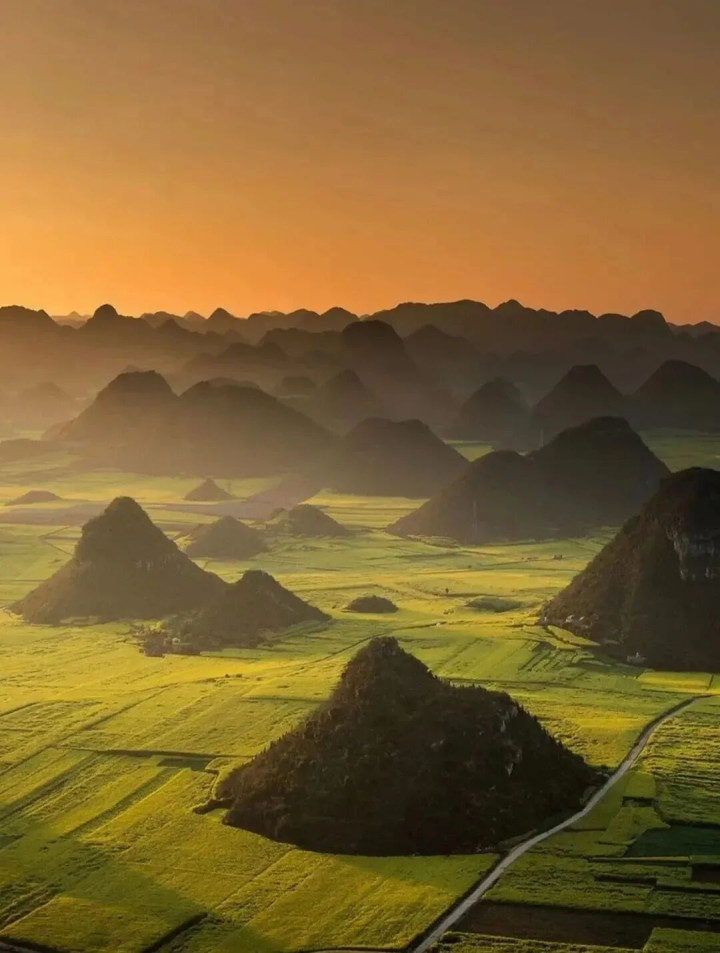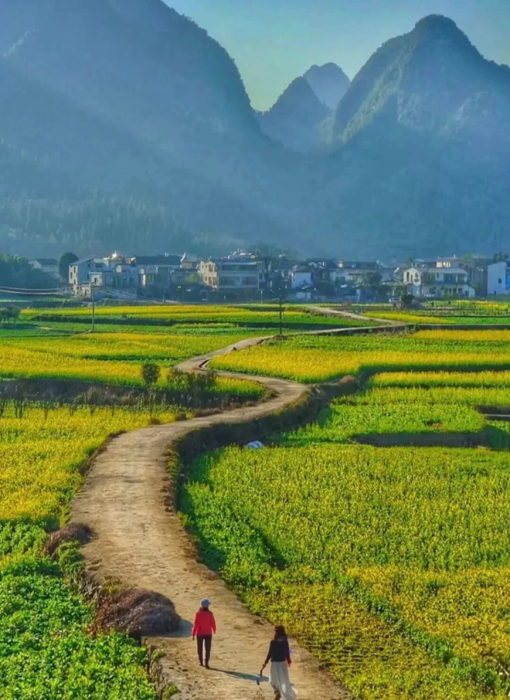 这里比罗平更安静,比婺源更憨厚,连油菜花海也开在了喀斯有意貌的峰林间。 阳光透过山岭,勾画出山的抽象,丁达尔光洒落在村庄上,真应了徐霞客写的那句“宇宙山岭何其多,唯有此处峰成林”。