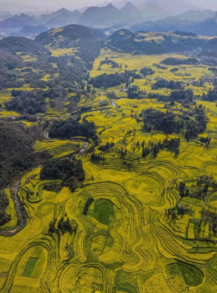 贵州的春天,编织出一个诗意的原野。 在贵州的罗和睦兴义万峰林都不错看到油菜花田,在峻岭山地之中,油菜花沿着喀斯有意貌的梯田从山顶铺散到山谷,站在山顶远看,中间还洒落着青瓦住户,白墙黛瓦就羼杂在金黄之间,分外温煦。