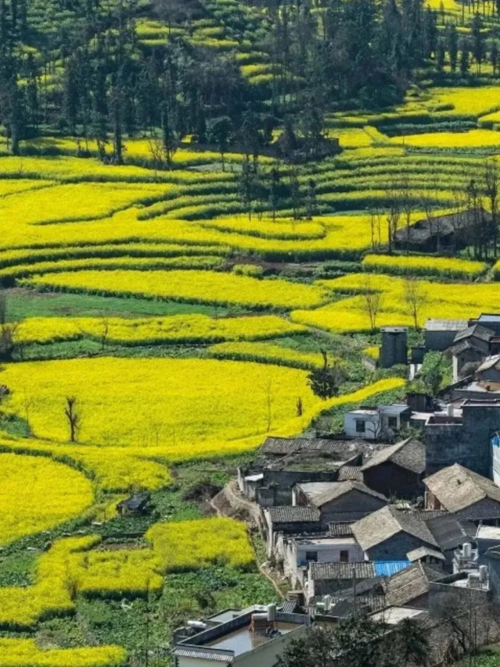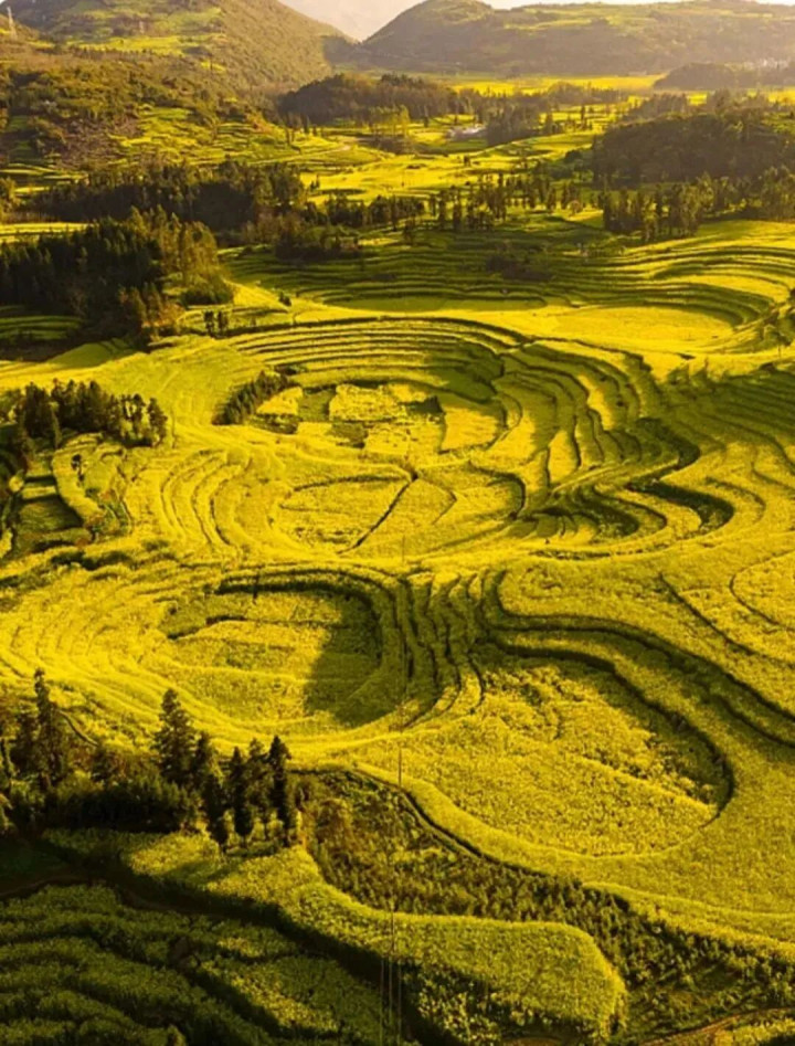 还有离罗平县约10公里的「牛街螺丝田」更能看到藏在螺旋梯田间的大片金黄,漫山铺鹅黄铺碎,其间点缀着褭褭炊烟,令东谈主洗浴。