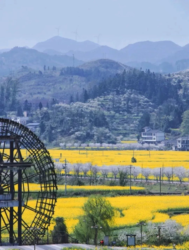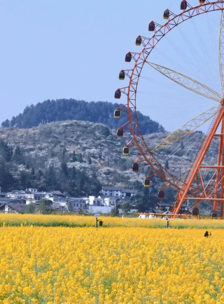 这里离贵阳有一个半小时车程,除了赏花,还能看摩天轮和坐小火车穿梭在花海中。 远离了嘈杂和喧嚣,金黄的花朵与水车房呼应,让东谈主感到一份发愤的宁静致远。