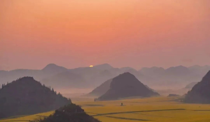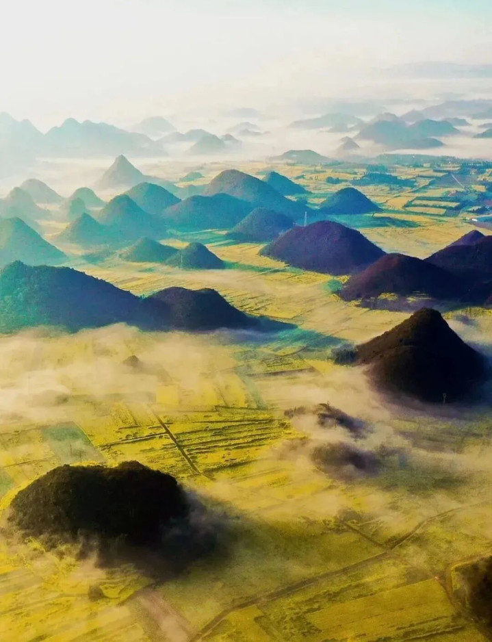 从2月初到4月,在离罗平县城9公里的「金鸡峰丛」就不错看到成片的花海。油菜花遍布在锥状的山包里,当日出或日落的光洒下,画面感绝了。
